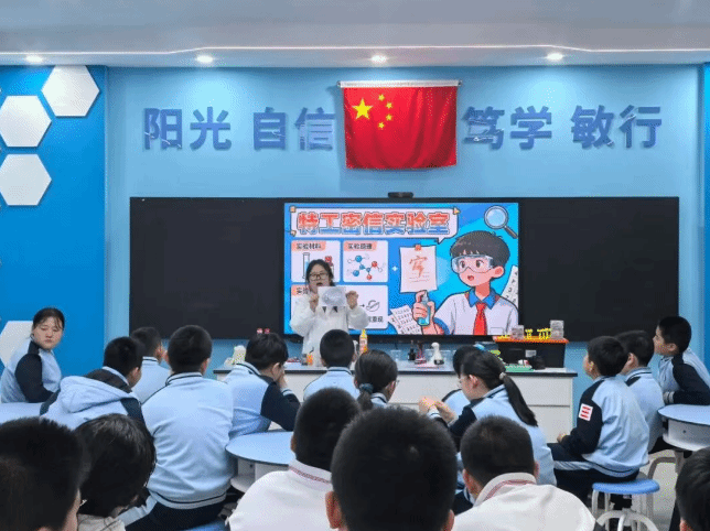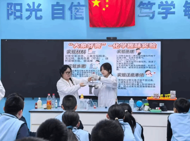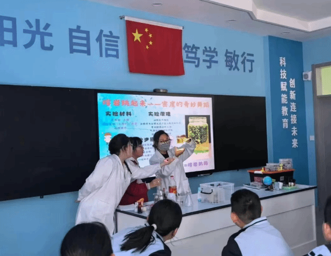 活动现场,志愿者们依托化学与环境科学专业背景,精心设计了四大趣味实验。熔岩灯:彩色液体在瓶内上下翻滚如岩浆流动,直观展示密度与对流原理,唤起孩子们的探究欲;变色棒棒糖:借助简易操作实现色彩渐变,妙趣横生,带来了极大的视觉冲击,让孩子们在色彩变化中感受科学魅力;大象牙膏:泡沫似火山喷发般汹涌而出,将现场氛围推向顶点,直观呈现化学反应的爆发力,让学生们目不转睛、跃跃欲试;特工密信:通过特殊书写与显影方式,让隐藏字迹显现,在神秘感中传递酸碱反应的科学知识。