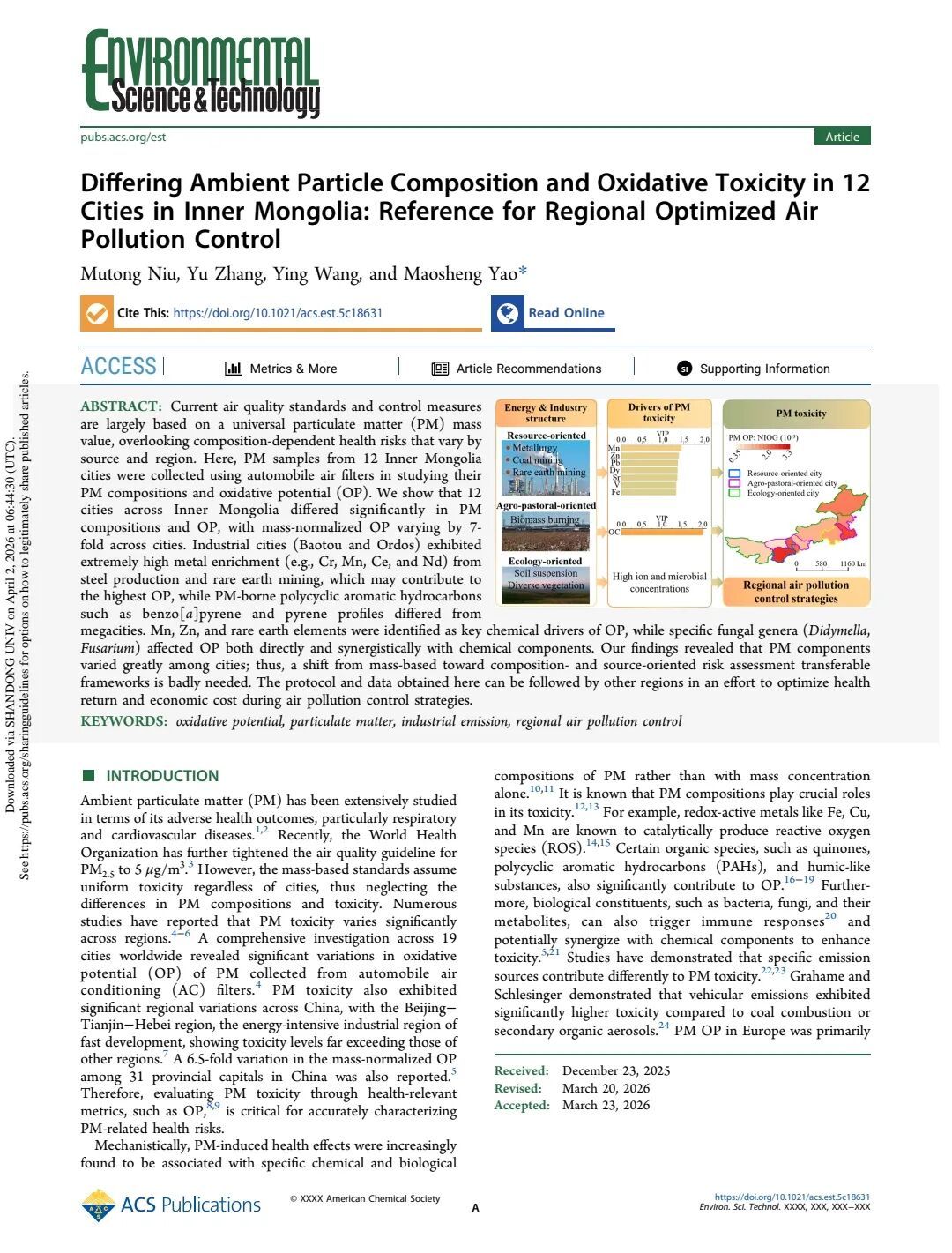 重磅!我院首篇环境领域顶刊 ES&T 论文发表,揭秘内蒙古 12 盟市颗粒物组分与毒性差异