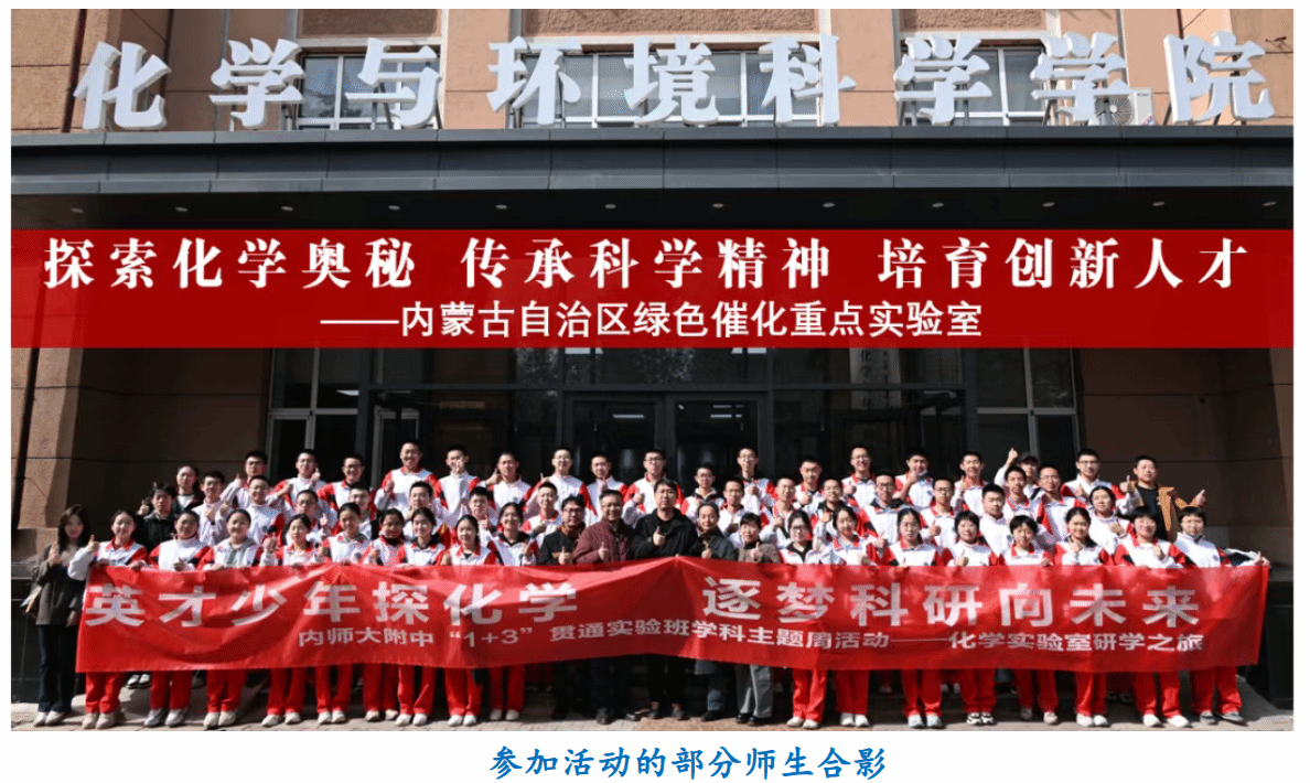 3月21日,内蒙古师范大学附属中学2026级“1+3”贯通培养实验班全体同学,由杨智慧老师,杨超老师和张语书教师带领来到内蒙古师范大学化学与环境科学学院,参加开启“探索化学奥秘 传承科学精神 培育创新人才”主题科普活动。此次活动由师大附中科学副校长王海燕副教授发起,内蒙古自治区绿色催化重点实验室、绿色催化党支部、内蒙古水环境安全协同创新中心联合组织。